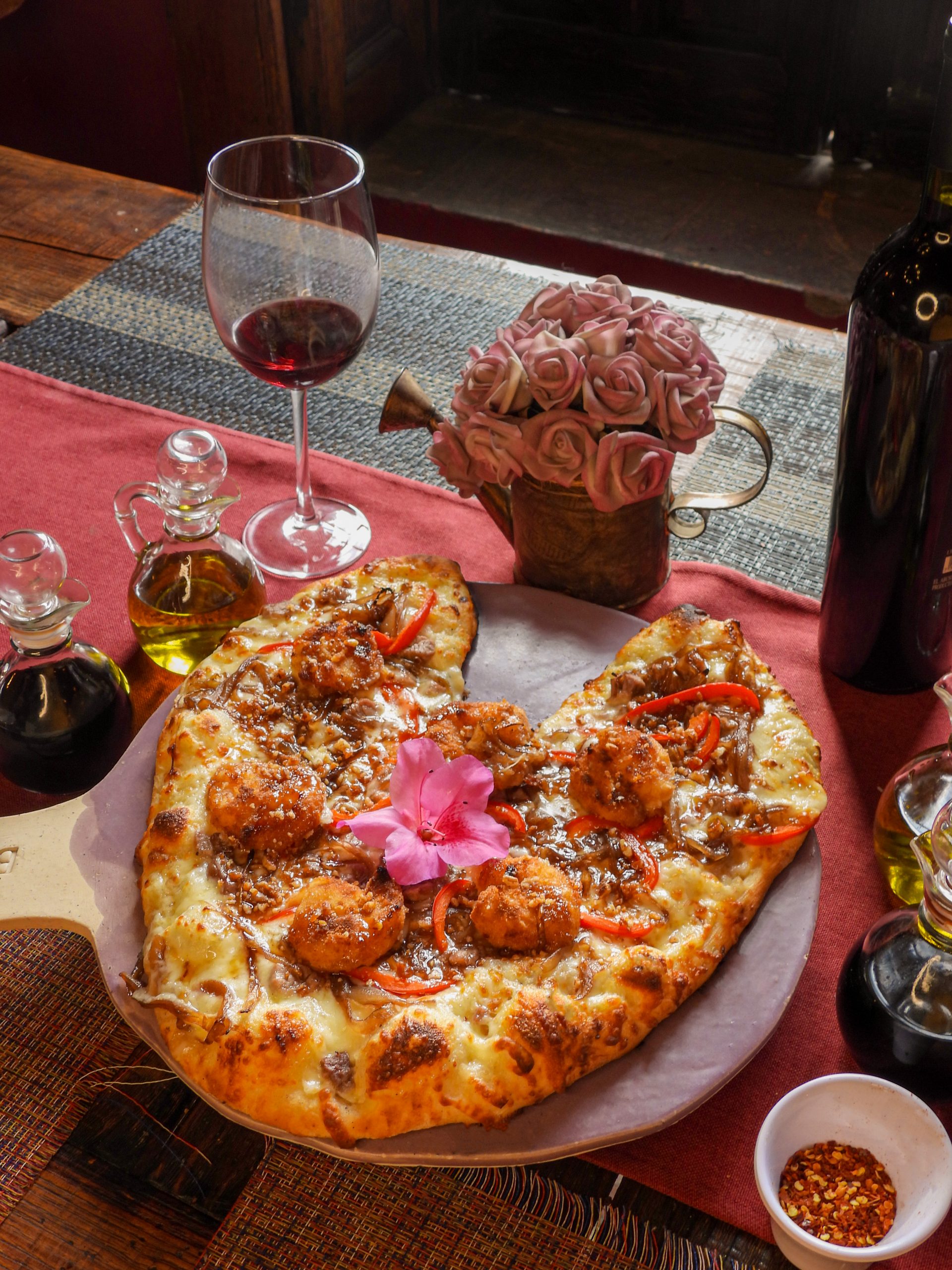 Masa New York Style en forma de corazón con queso mozzarella fior di laLe, salsa blanca de ajo y gorgonzola, camarones empanizados, rib eye, cebolla caramelizada, nuez caramelizada y miel de arce picante